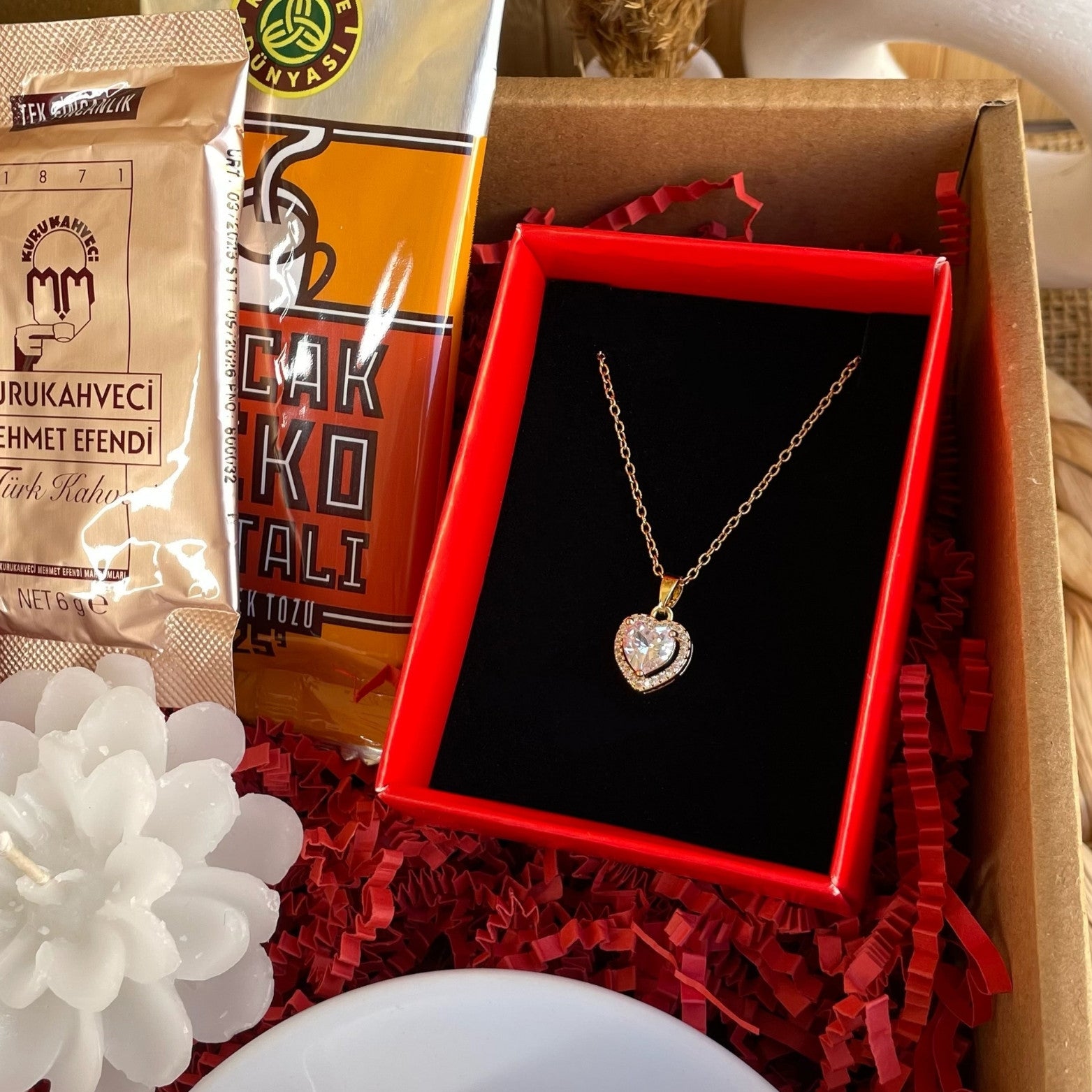 Sevgililer Günü Temalı - Lüks Kupa & Türk Kahvesi Fincanlı Kolyeli Premium Hediye Kutusu